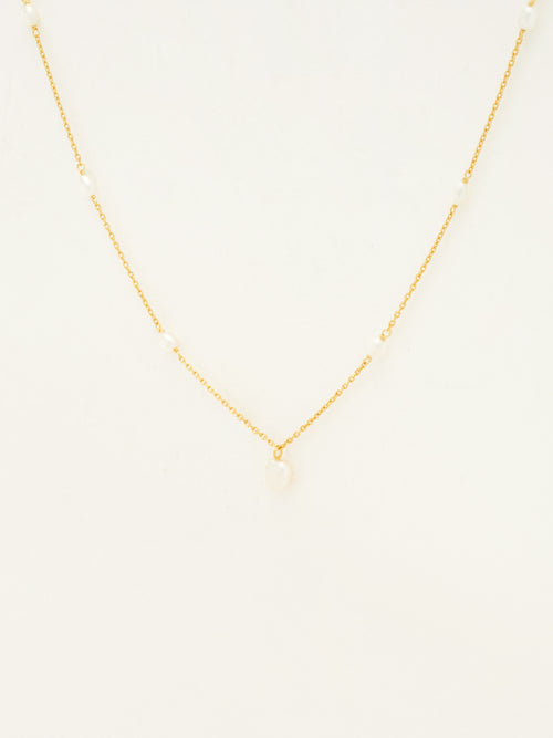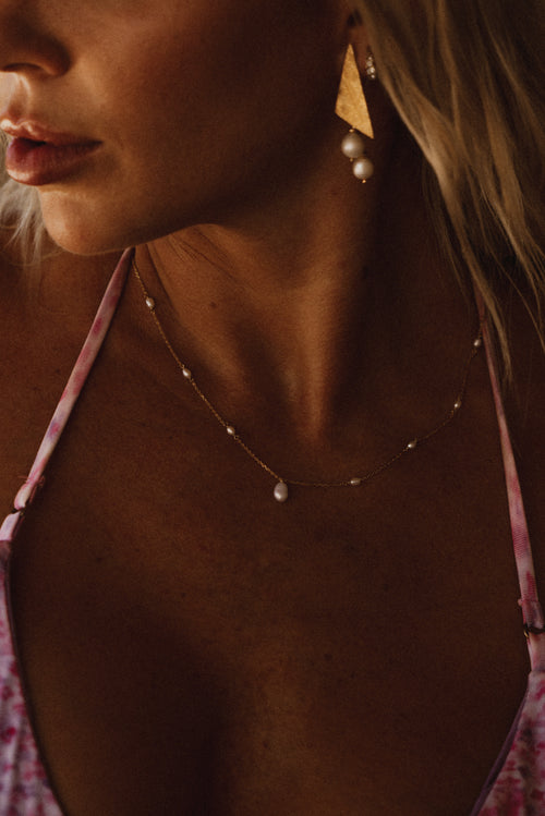 As fashions ebb and flow, the classic blend of gold and pearls remains a bastion of style, like the Amelia Pearl necklace. On a dainty 925 silver gold-plated cable chain, fine pearls lead to a large drop pearl that swings gracefully. The adjustable clasp offers versatile styling, whether worn long or choker-style, making it suitable for many occasions.