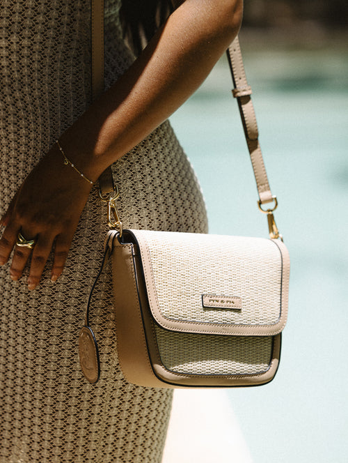 Evoking seaside days, the Amelia Saddle Bag in Sand Raffia-Effect & Beige is a versatile staple for any wardrobe, from classic to contemporary. Styled with textured raffia and beige leather highlights, this luxurious accessory easily fits all your essentials, while the adjustable strap with bronze-toned hardware offers cross-body or shoulder carry.