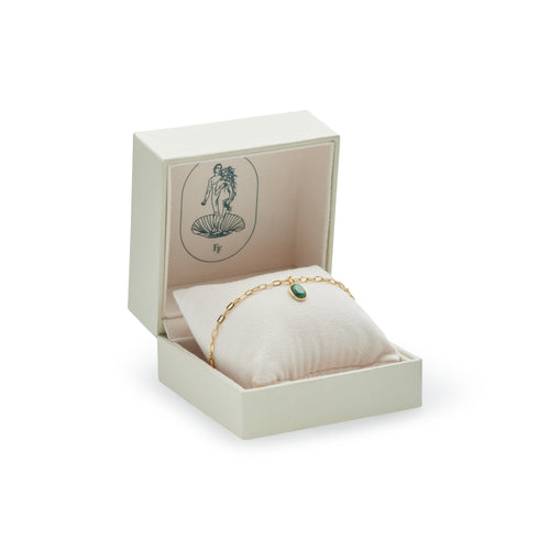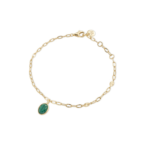 Utterly beguiling, the Angelina Bracelet reflects nature’s beauty with a swirling oval malachite pendant on a classic cable chain. Known for its protective properties, malachite wards off danger and illness, imbuing peace and positivity. This luxurious piece exudes sophistication and features an adjustable clasp to fit any wrist. To complete your look, pair it with the matching Maria necklace.