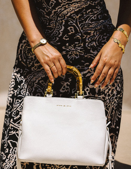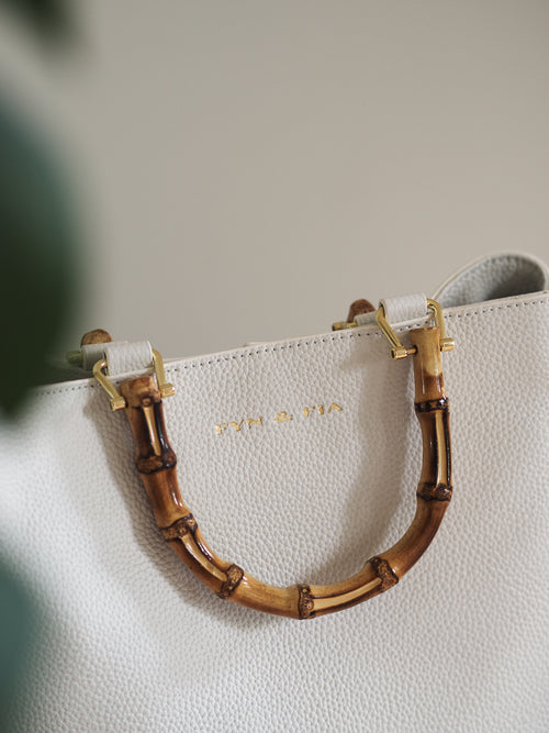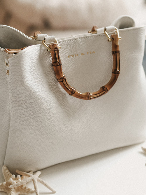 Styled in a versatile bright ivory finish, the Isabella handbag features a spacious central opening with convenient and secure open interior pockets. Choose between bamboo handles or an adjustable strap for a comfortable carry. Finished with our signature Fyn & Fia logo in gold foil, it is a timeless sophisticated addition to any ensemble.