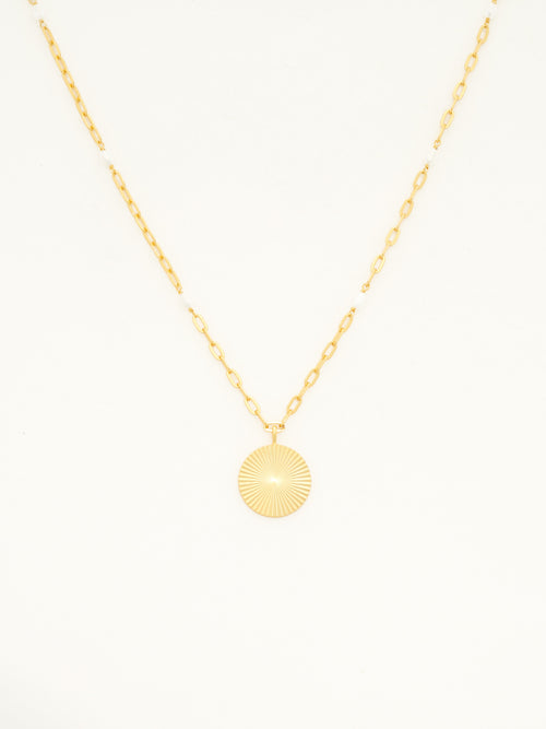 Inspired by its name, the Mia necklace is beloved by all who wear it. The classic cable chain showcases a stunning gold sunburst pendant with fluted textures resembling sun rays. Fine pearls interspersed along the chain elevate it from beautiful to breathtaking. Be radiant with the Mia necklace.