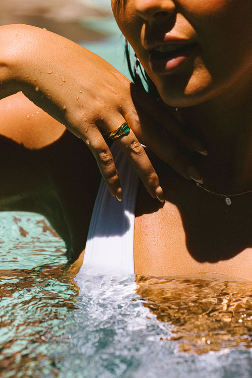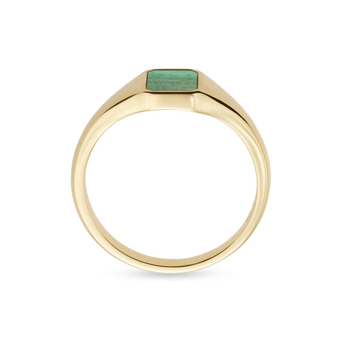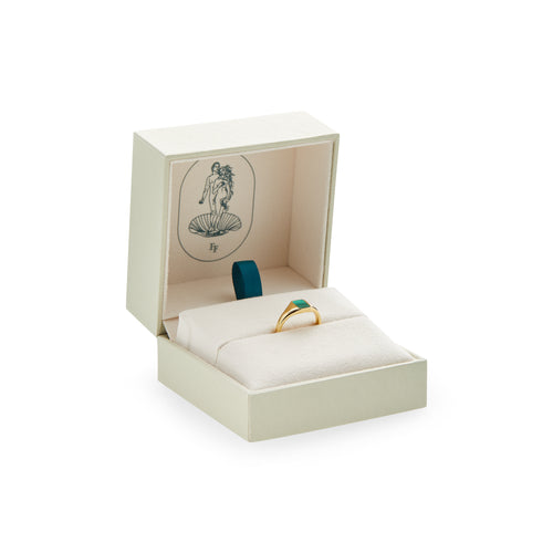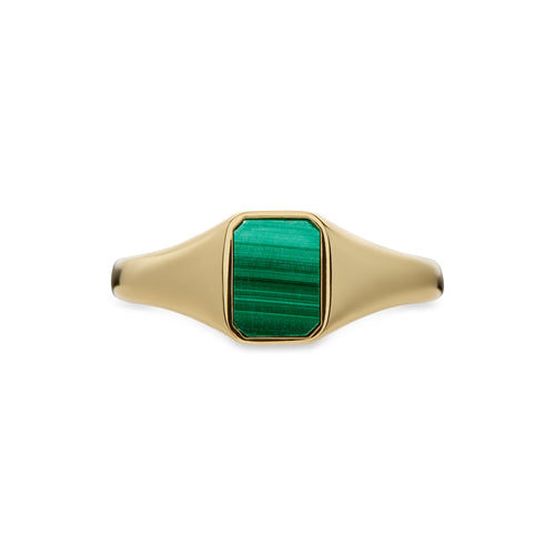 Discover statement style with the Miranda ring. Made of 18K gold vermeil, this signet-style ring features a striking malachite stone with a signature green gradient. Known for its protective properties, malachite wards off danger and illness, imbuing peace and positivity. Versatile and sophisticated, the Miranda ring is a defining piece for any jewelry collection.